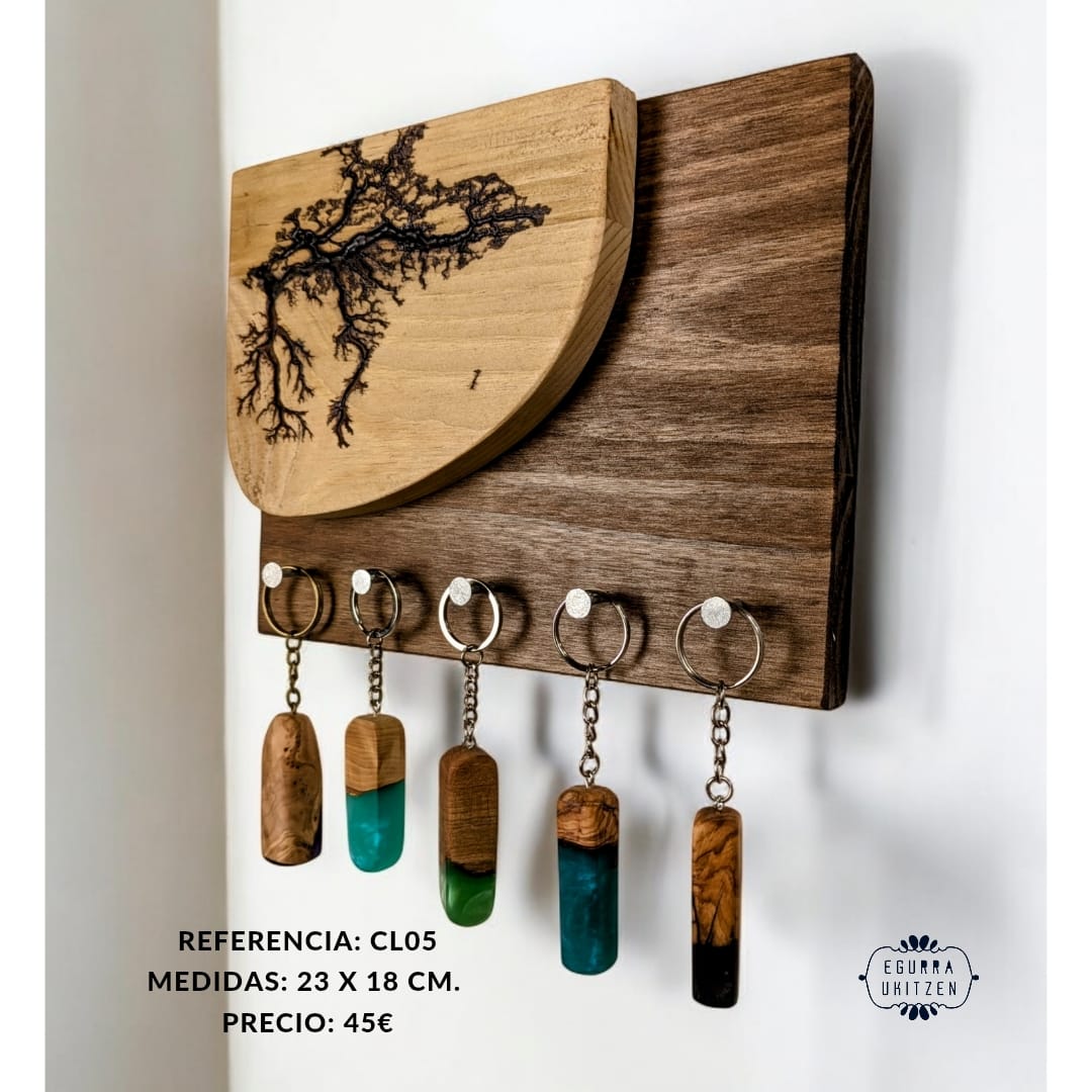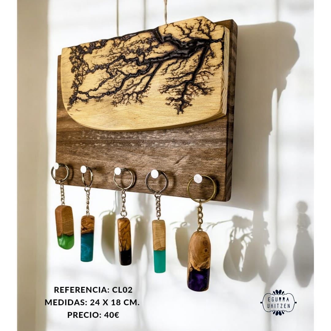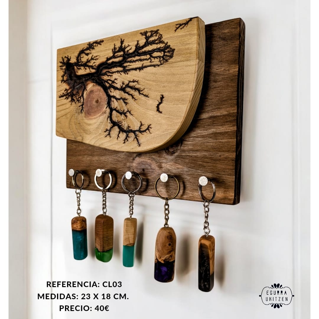 Las figuras Lichtenberg son imágenes producidas por descargas eléctricas ramificadas, arborescentes. El nombre de la arborescencia viene debido al patrón que siguen las figuras, muy parecido a la morfología arbórea. Sin embargo, se ha descubierto que las ramificaciones, nada tienen que ver con el verde vegetal, más bien poseen propiedades fractales. Reciben su nombre debido a su descubridor, Georg Christoph Lichtenberg en 1777, y son figuras que se crean al someter grandes descargas eléctricas a materiales aislantes, en nuestro caso, madera. En nuestro canal de YOUTUBE mostramos vídeos de la realización de esta técnica tan bonita, como arriesgada. Con esta técnica elaboramos colgadores de llaves como estos, todos realizados con madera recuperada y totalmente desparasitada.