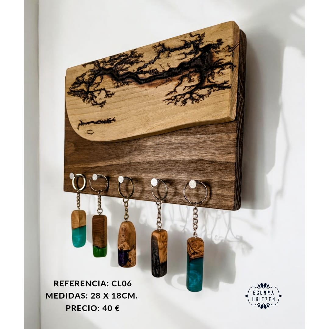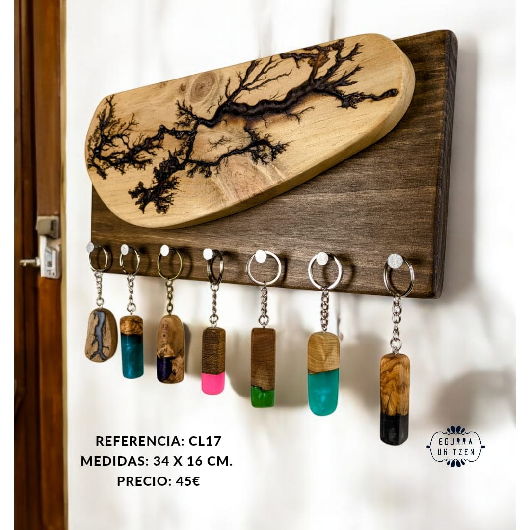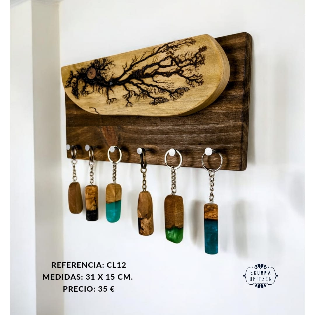 Las figuras Lichtenberg son imágenes producidas por descargas eléctricas ramificadas, arborescentes. El nombre de la arborescencia viene debido al patrón que siguen las figuras, muy parecido a la morfología arbórea. Sin embargo, se ha descubierto que las ramificaciones, nada tienen que ver con el verde vegetal, más bien poseen propiedades fractales. Reciben su nombre debido a su descubridor, Georg Christoph Lichtenberg en 1777, y son figuras que se crean al someter grandes descargas eléctricas a materiales aislantes, en nuestro caso, madera. En nuestro canal de YOUTUBE mostramos vídeos de la realización de esta técnica tan bonita, como arriesgada. Con esta técnica elaboramos colgadores de llaves como estos, todos realizados con madera recuperada y totalmente desparasitada.