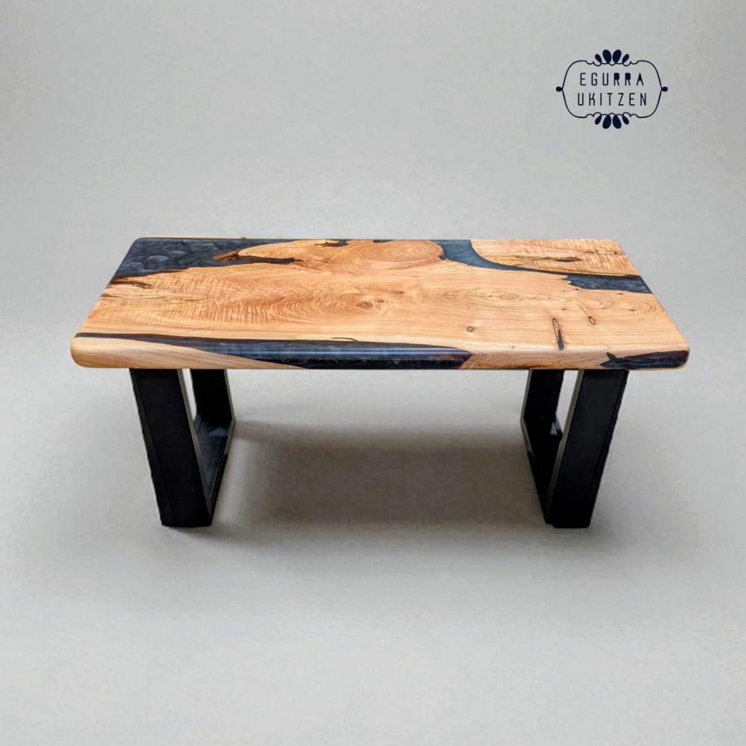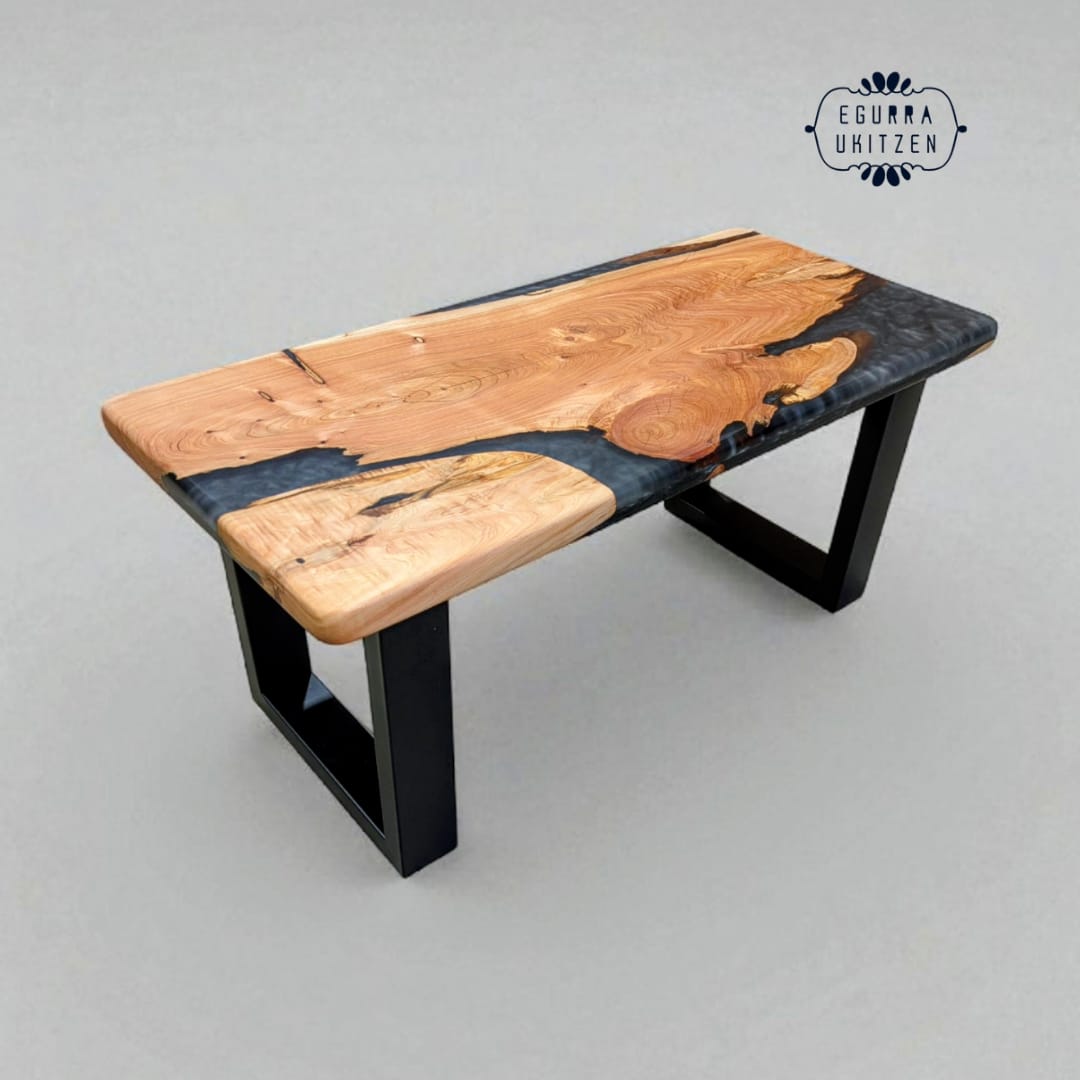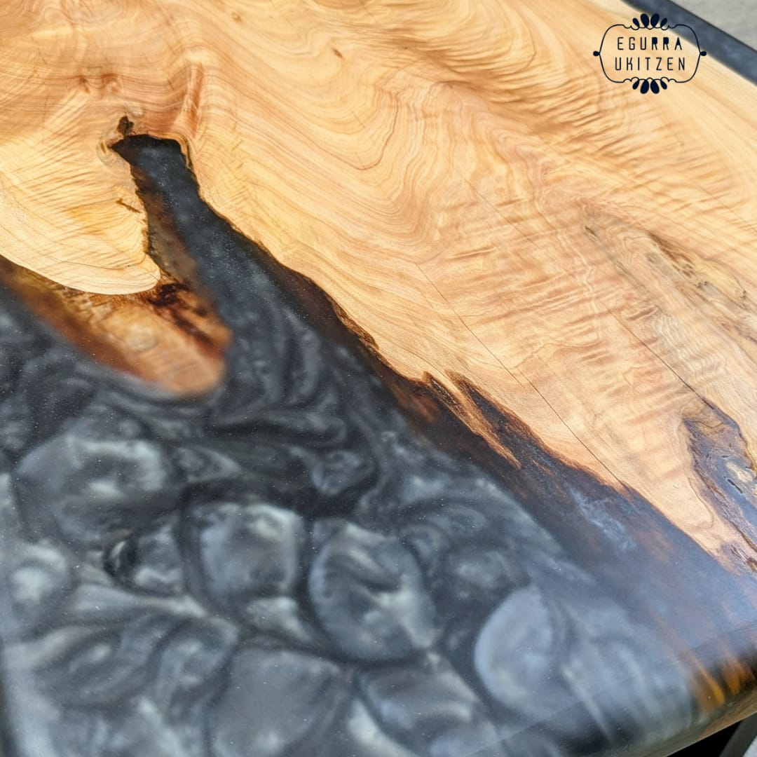 Esta pieza única combina la calidez natural de la madera de ciprés con la elegancia contemporánea de la resina negra metalizada. Su diseño orgánico resalta las vetas y texturas originales de la madera, mientras que la resina fluye entre ellas, creando un contraste sofisticado y armonioso.