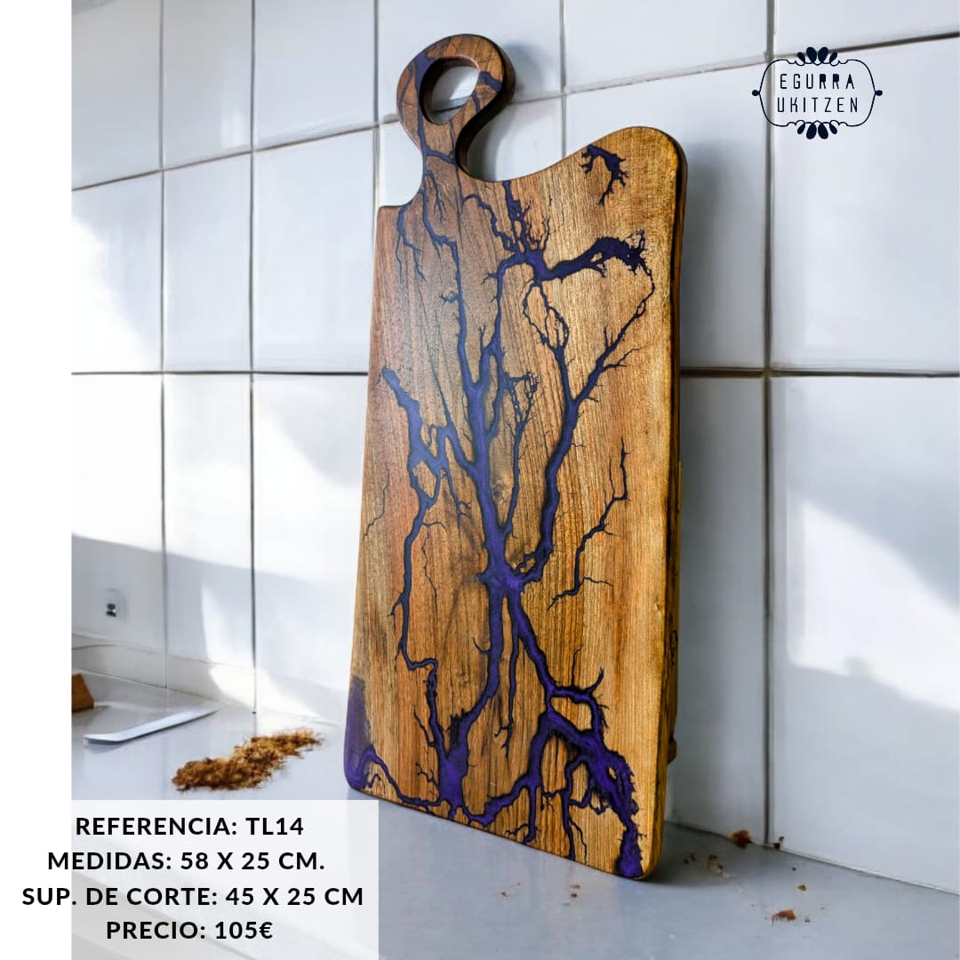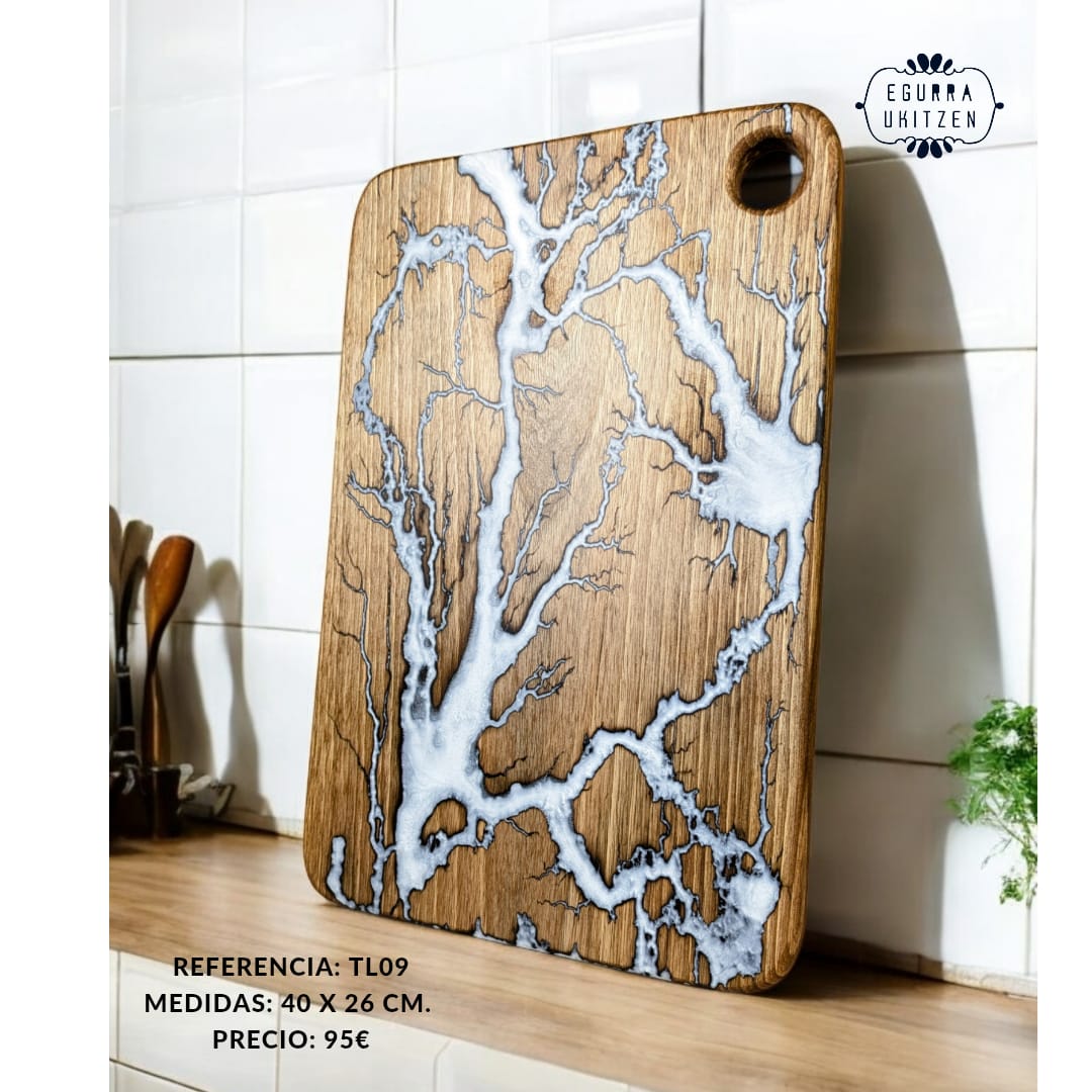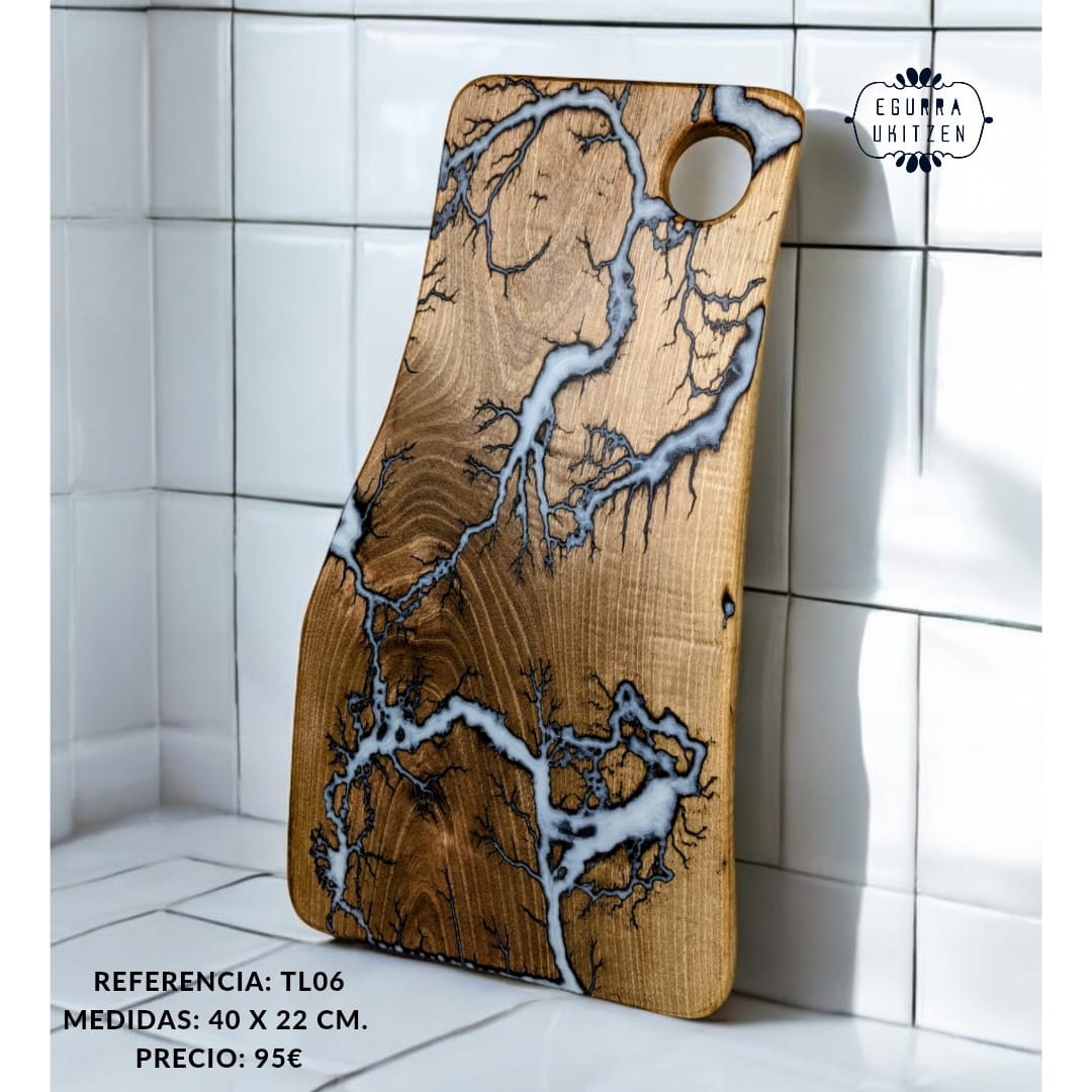 Cada pieza única está meticulosamente elaborada a mano con madera de nogal, destacando Figuras Lichtenberg en una de las caras, que le confieren un carácter distintivo. Las caras posteriores de cada tabla no suelen llevar resina, dando así la oportunidad de utilizar esta cara para el corte y la otra para servir.