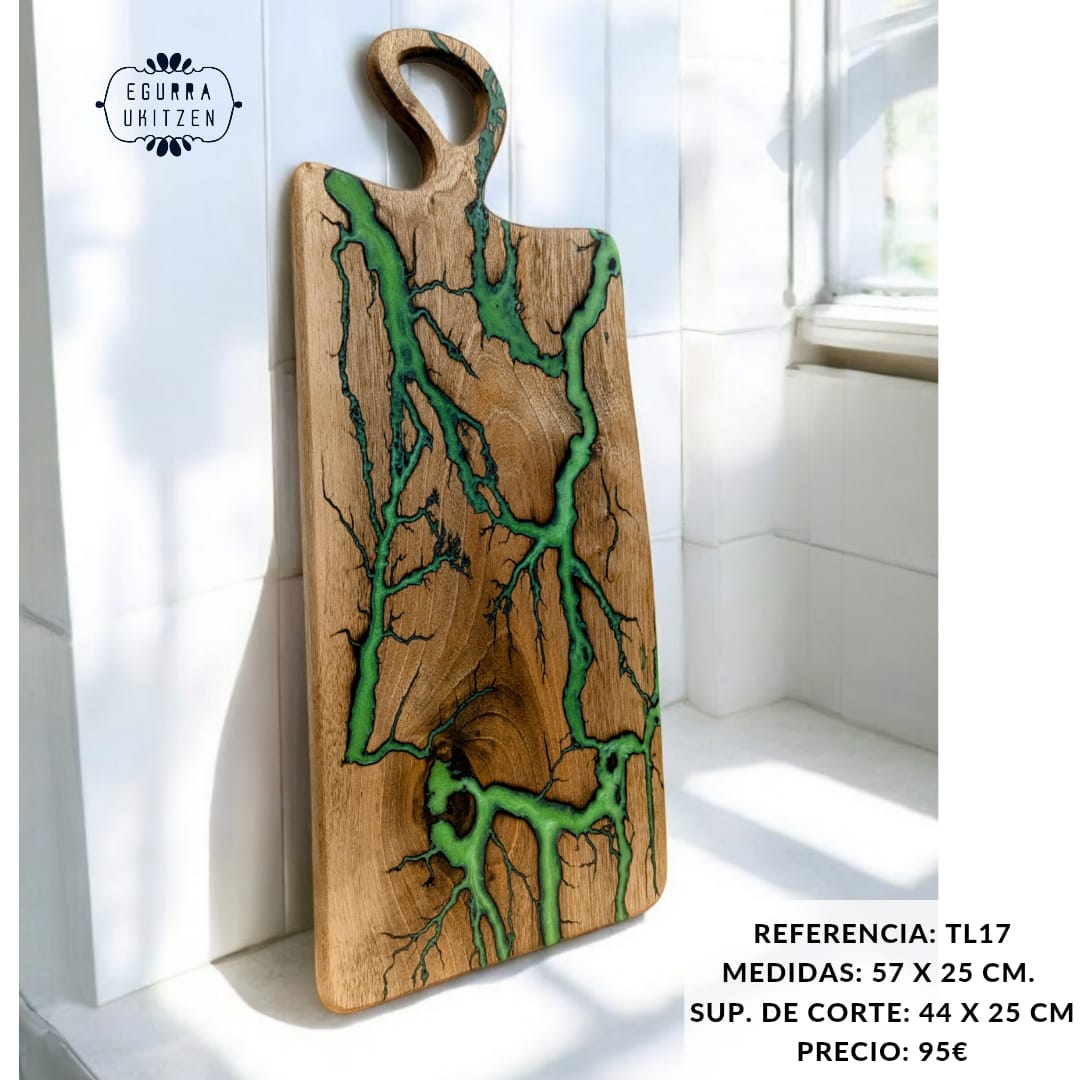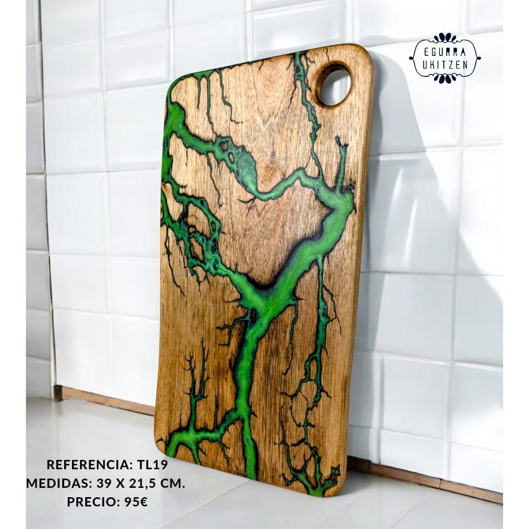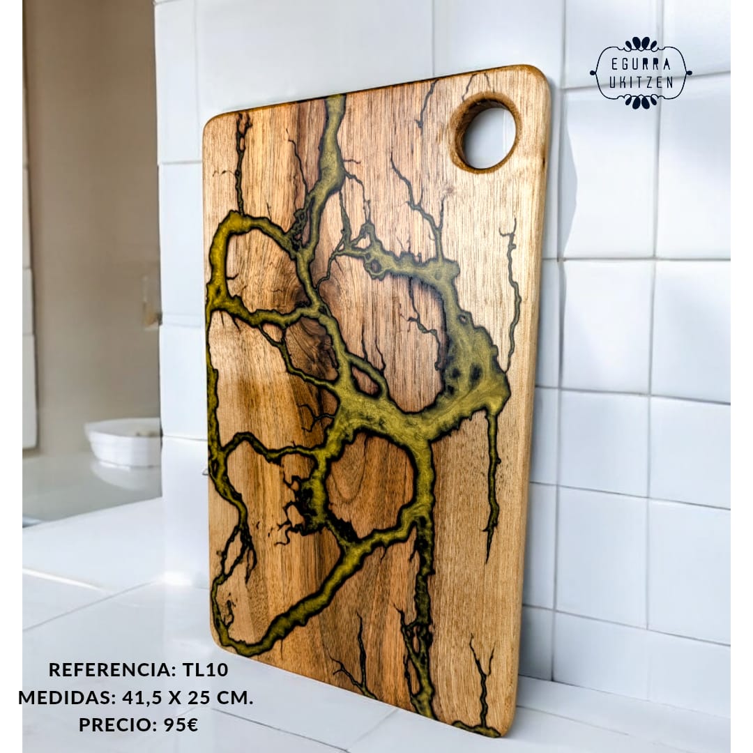 Cada pieza única está meticulosamente elaborada a mano con madera de nogal, destacando Figuras Lichtenberg en una de las caras, que le confieren un carácter distintivo. Las caras posteriores de cada tabla no suelen llevar resina, dando así la oportunidad de utilizar esta cara para el corte y la otra para servir.